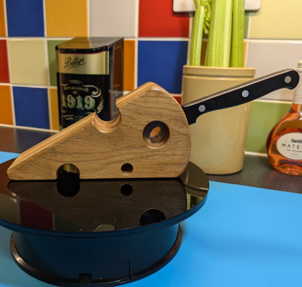 Here at Oak and Still Creations we have designed & meticulously crafted this unique cheese wedge knife block from kiln-dried quality Scottish oak. In this particular style of block we decided to go with creating various sized holes for a fun interpretation of cheese, and then paired it up with a Sabatier & Judge cheese knife with a black tough & durable handle made from Pom C material & stainless steel rivets