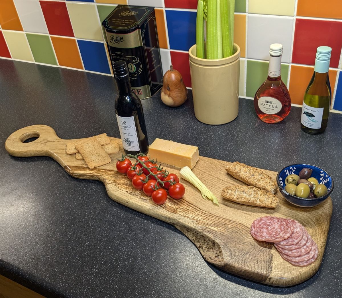 We are delighted to offer this amazing kiln-dried oak charcuterie serving board & oak wall hanger. We started the process of creating this wonderful board by hand-sketching its general outline whilst leaving an area of live-edge, highlighting the comfortable shape and flow. The grain and hue of the wood, in our opinion, is outstanding and will sit well in any kitchen as a unique display piece while remaining functional for showcasing your favourite delicacies – and of course a talking point around any table