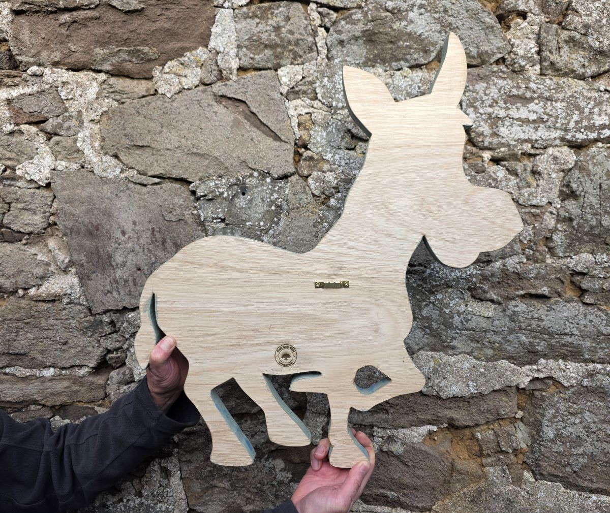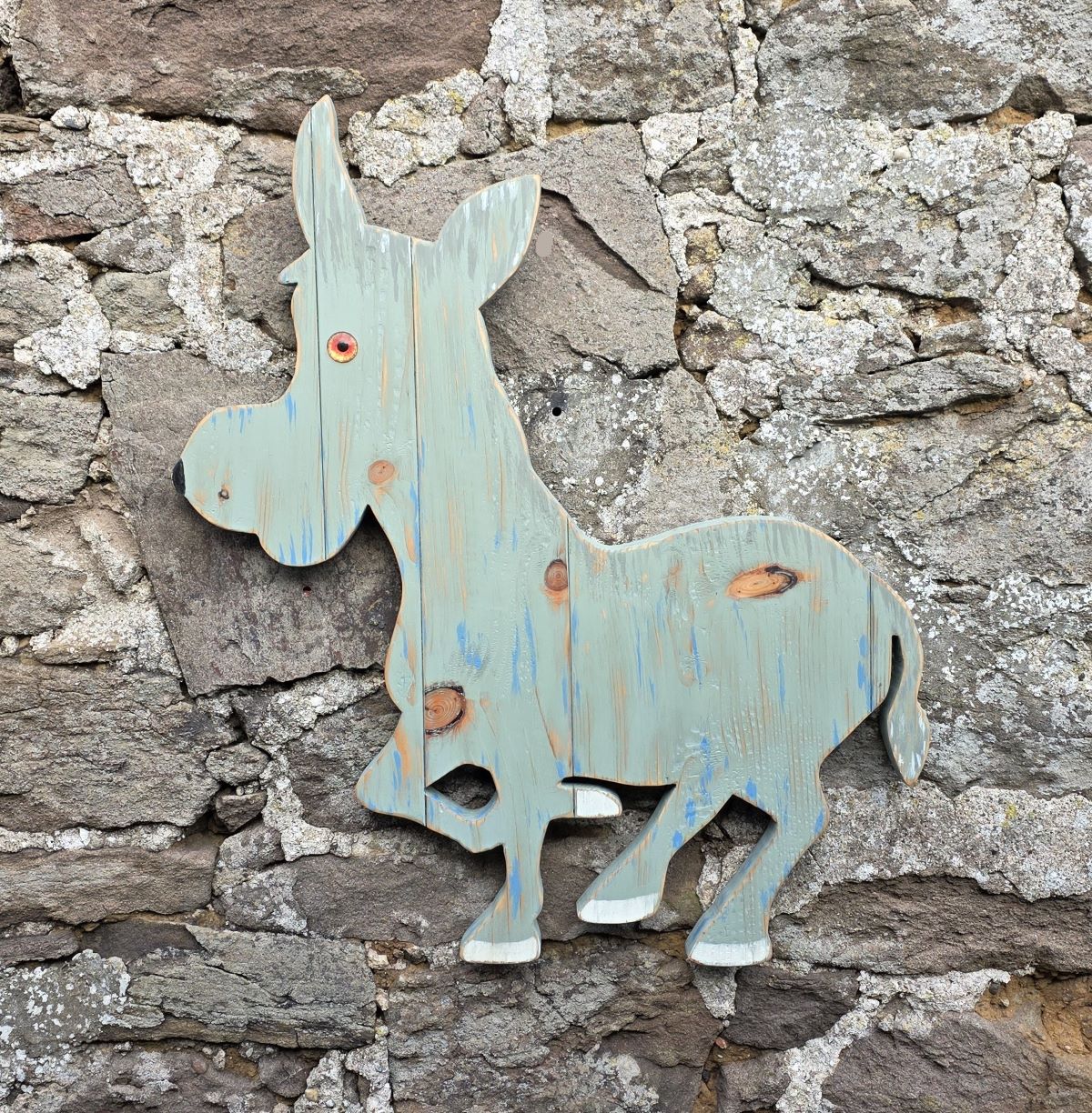 This high quality unique piece of wall art is handmade from re-purposed kiln-dried pine wood fitted on a plywood backing. We have created our own unique design to represent a fun style donkey, and painted this stunning piece in a sage green acrylic with highlights of white, grey & mid-blue, fitted a realistic protruding glass eye inset into the surface of the wood, and then finished with our own beeswax conditioner