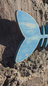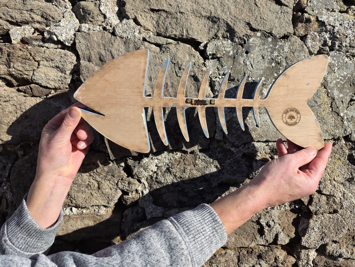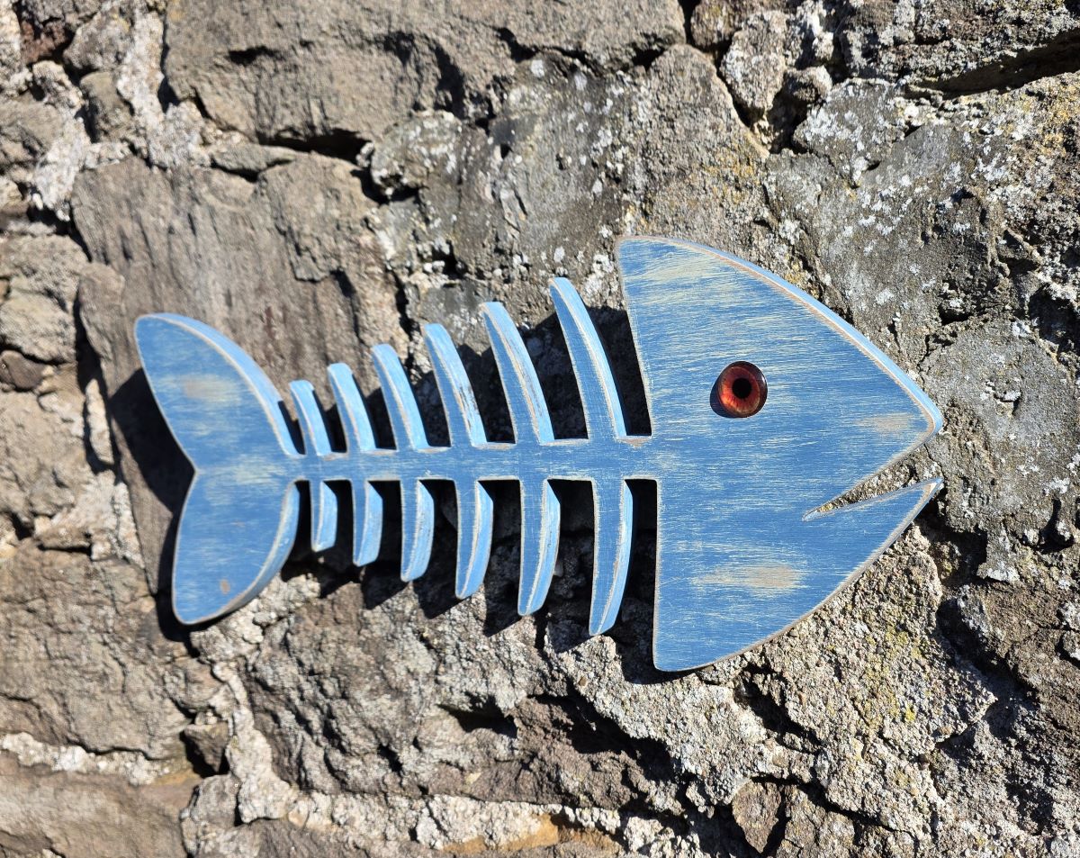 We have created our own unique fun design to represent the skeleton of a fish & cut it out in faux wood, then skillfully hand painted it in a beautiful shade of mid-blue acrylic with attractive white highlights, along with a realistic orange glass eye inset into the surface of the fish's head to complete the look