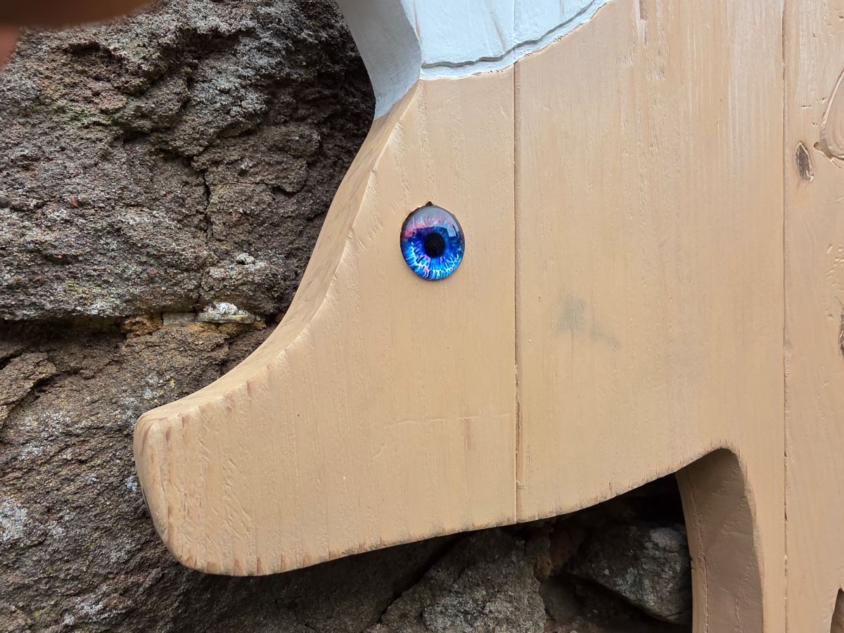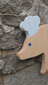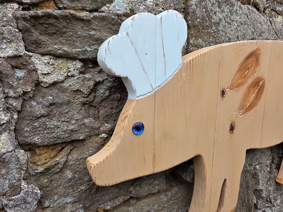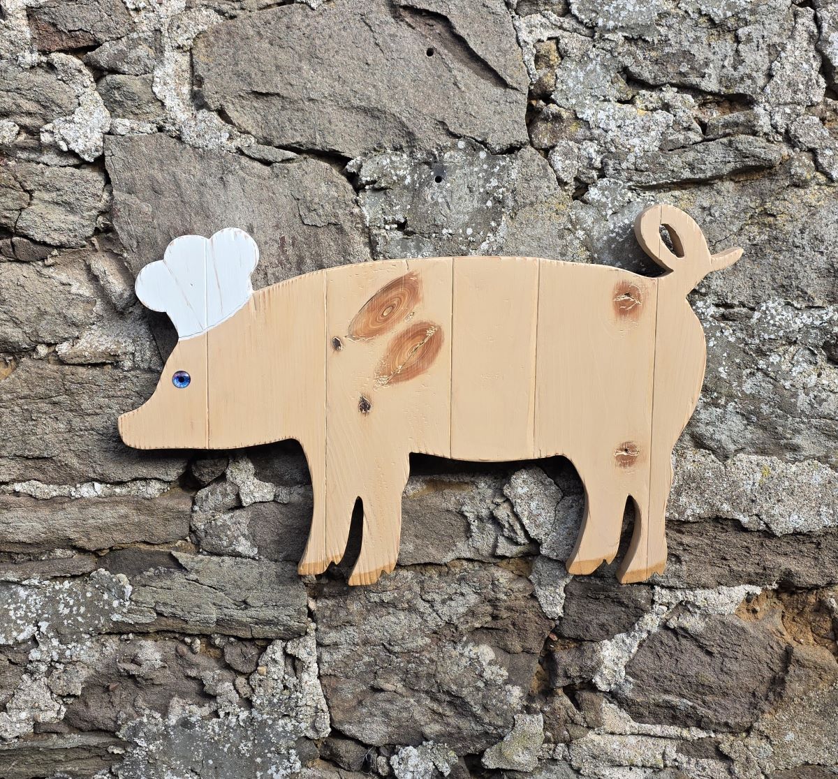 This high quality unique piece of wall art is handmade from re-purposed kiln-dried pine wood fitted on a plywood backing. We have created our own unique & fun design of a cartoon style pig wearing a white chef's hat, and painted this stunning pig in a shade of pig skin colour, fitted a realistic protruding glass eye inset into the surface of the wood, and then finished with our own beeswax conditioner