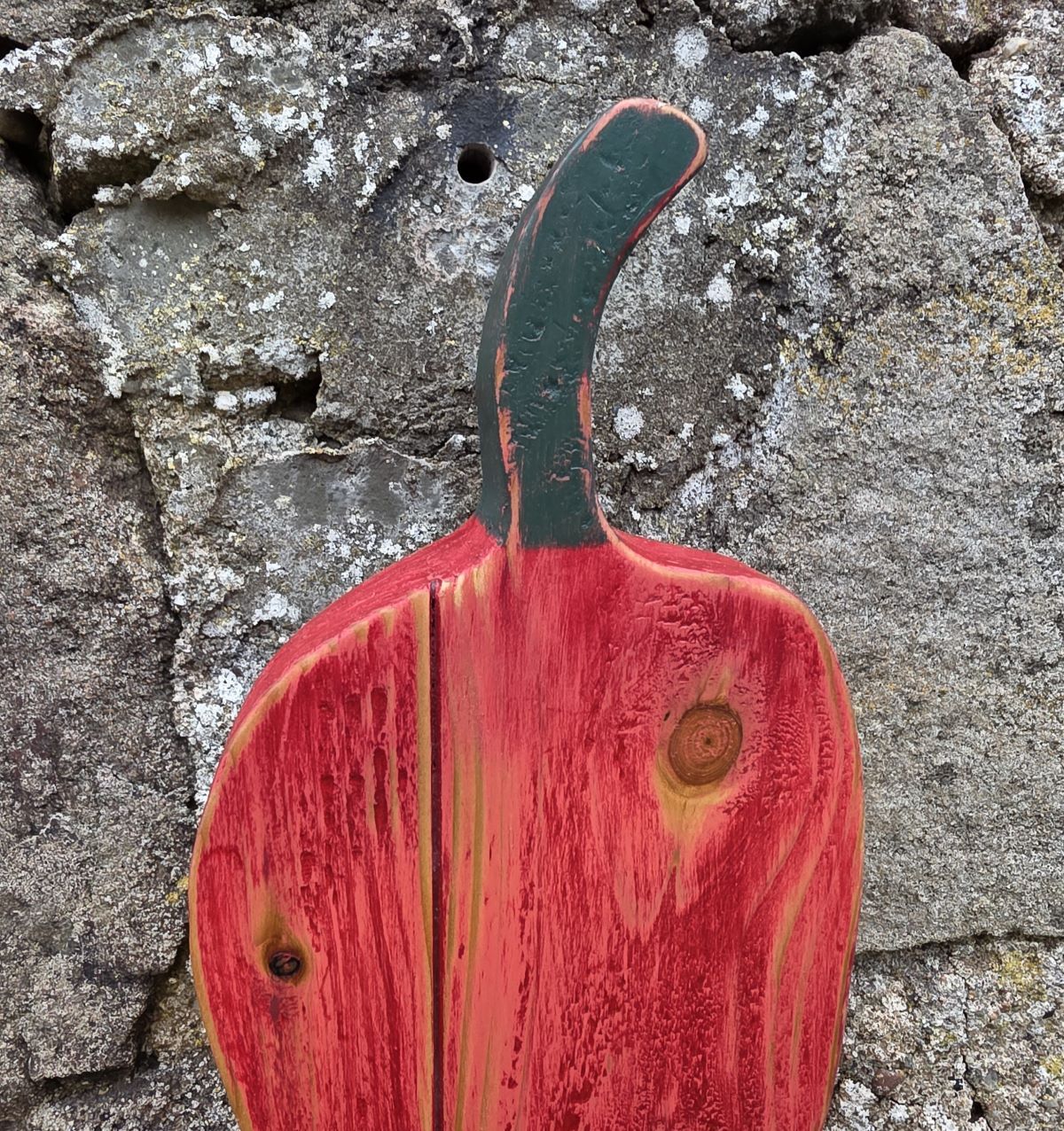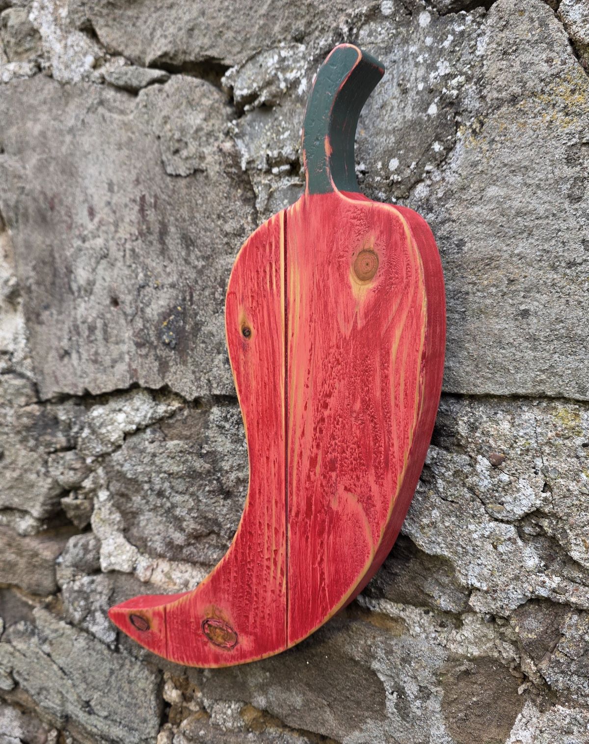 This high quality unique piece of wall art is handmade from re-purposed kiln-dried pine wood fitted on a plywood backing. We created our own unique design to represent a fiery chilli pepper, and painted this stunning piece in a beautiful shade of red (with a green stalk on top) then finished with our own beeswax conditioner