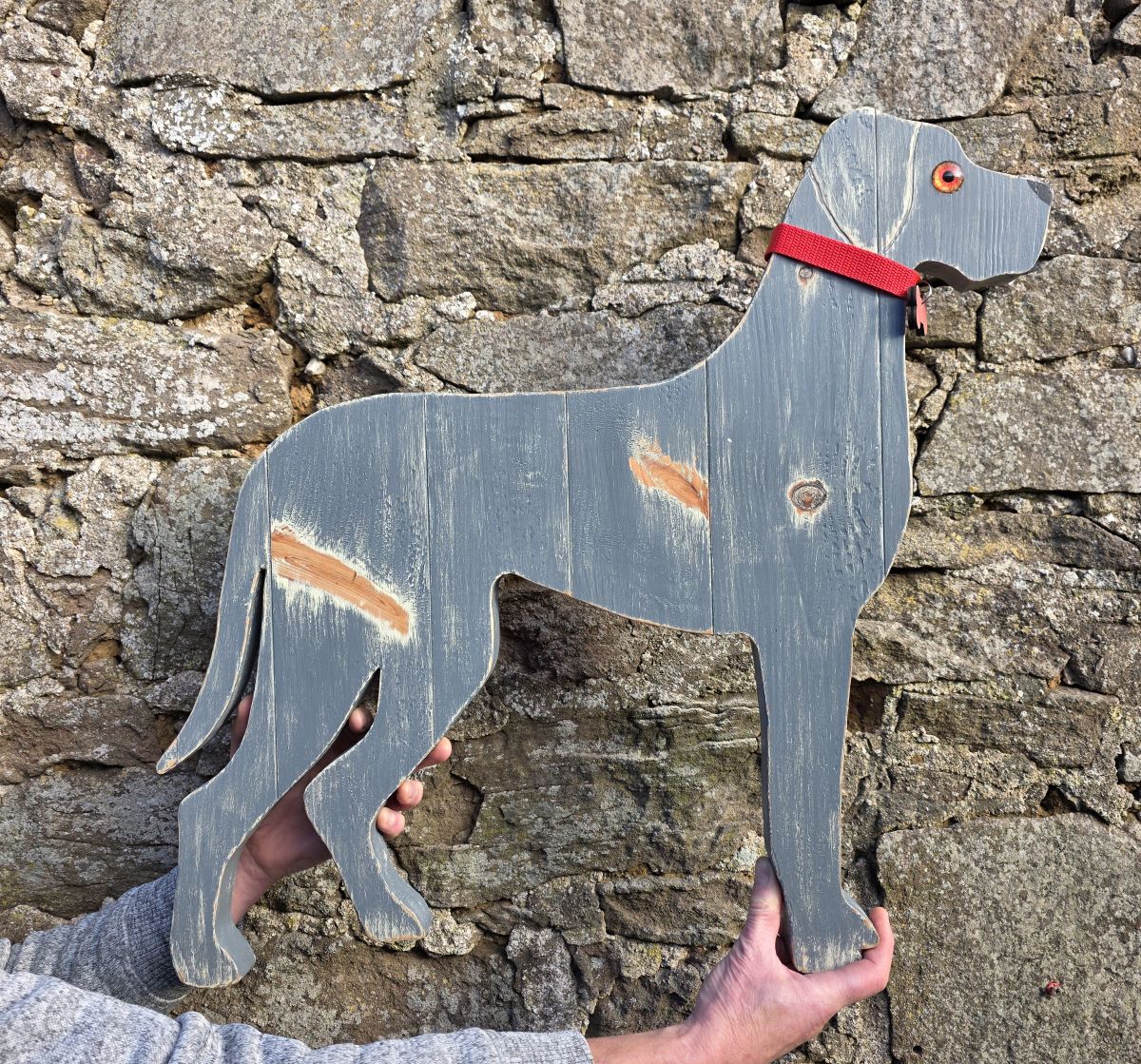 This high quality unique piece of abstract wall art is handmade from re-purposed kiln-dried pine wood fitted on a faux wood backing. We have created our own unique fun design to represent a popular Great Dane, and hand-painted this stunning piece in a stunning grey shade of acrylic with highlights of cream colour and a black coloured nose. We have applied detail to the wood to denote the ear, then fitted a realistic orange glass eye inset into the surface of the wood to complete the look