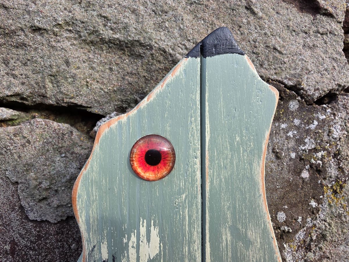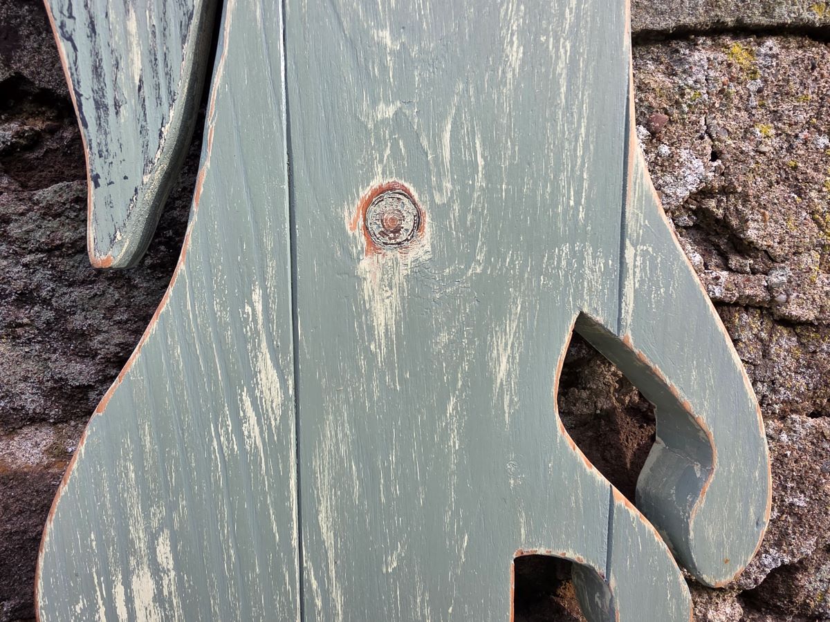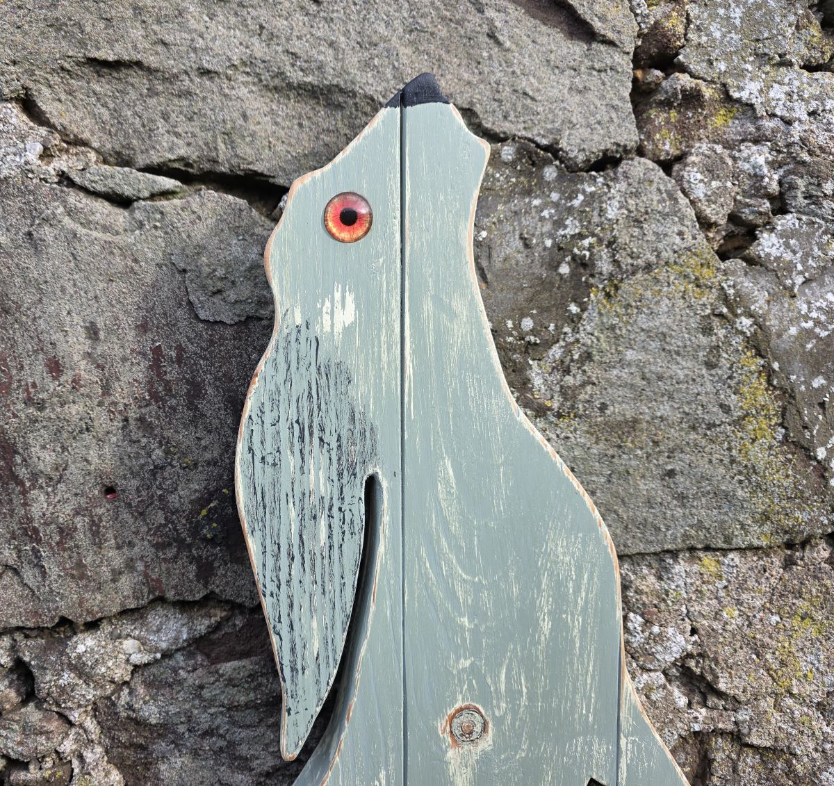 This high quality unique piece of wall art is handmade from re-purposed kiln-dried pine wood fitted on a faux wood backing. We have created our own unique fun design to represent a popular Hare, and painted this stunning piece in a beautiful shade of sage green acrylic with cream coloured highlights, with the hare's ear having undertones of black. A realistic protruding orange glass eye is inset into the surface of the wood to complete the look