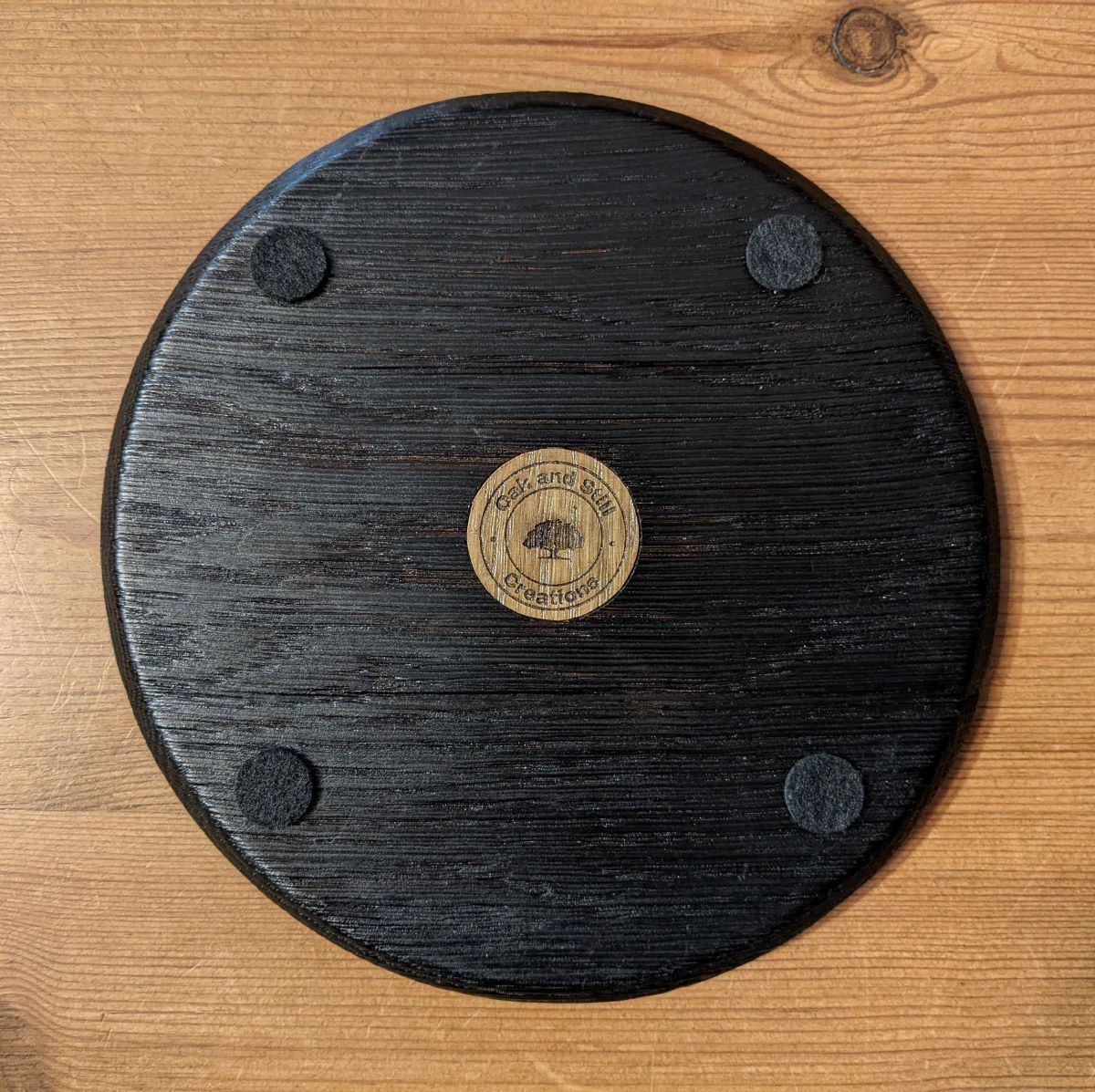 The underside of the 'barrel lid' plinth has our inlaid company logo & four felt adhesive pads & the copper leaf coaster has five pads to protect your furniture
